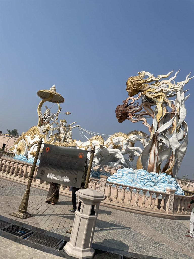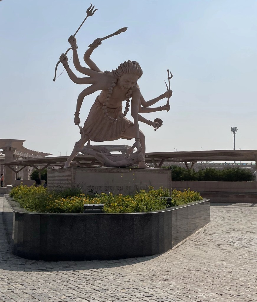इस महाकाल लोक के परिसर में स्थापित विभिन्न मूर्तियों से भिन्न एक विशाल मूर्ति अद्भुत बन पड़ी है जो त्रिपुरासुर संहार की है जिसमें महाप्रभु ब्रह्मा जी के रथ संचलन में महाकाल प्रभु ने पाशुपतास्त्र का संधान किया है जिसके द्वारा त्रिपुरासुर के तीन असुर भाइयों का विनाश संभव हो पाया था. यह विहंगम दृश्य आपको निःशब्द कर देता है और आप स्थितप्रज्ञ हो इस मूर्ति रूप से निर्वचनीय कथा का रसास्वादन करते चले जाते हैं जैसे इस संहार की कथा आपके मन के नेपथ्य में गूंजती रहती है. इस भव्य मूर्ति को देख शिव प्रभु के जीवन के मूल्यों की शुचिता को बनाए रखने हेतु संहार की अवधारणा को समझा जा सकता है. त्रिपुरासुर के असुर धार्मिक थे परंतु शक्ति और माया में भर जाने से माया में खो गए जिससे उनका संहार करने महामानव को स्वयं उपस्थित होना पड़ा था. महामना और प्रथमपूज्य गजानन महाराज की मूर्ति अद्भुत रूप से वायुशैली में स्थापित है जिसमें श्री गणेश भगवान के दोनों पैर नृत्य शैली में हवा में अवस्थित हैं. एक और विशाल प्रतिमा शिव भोले की चतुर्भुज दक्षिण मुकुटधारी मनमोहक है जिसे देख आप की नमो नमः कहे बिना नहीं रह पाते हैं. इसके अतिरिक्त समाधिस्थ शिव की मूर्ति अतिविशाल है जो हिमालय में कहीं शिव के ध्यान मग्न हो परमानंद की अवस्था में प्रस्तुत होती प्रतीत होती है. साधुमन को यह प्रस्तुति ब्रह्म सत्य, जगत मिथ्या के बौद्ध-सोच का आधार बन जाती है और ऐसी कई मूर्तियों को देख शिव-पुराण में वर्णित शिवलीला का प्रस्तुतीकरण विस्मय से भर देता है और आप धार्मिकता की अग्रणी अवस्था या ने आध्यात्मिक हुए बिना नहीं रह पाते हैं.