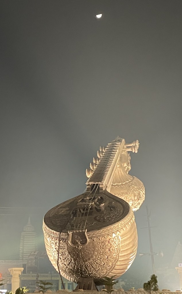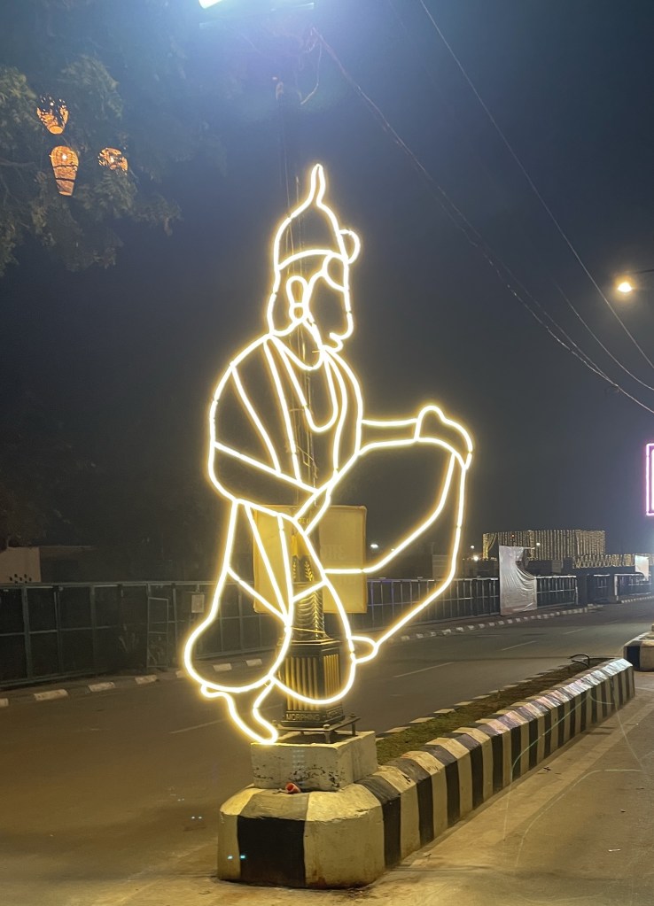 अयोध्या के प्रवेश पर एक विहंगम प्रवेश द्वार दूर से प्रदर्शित होता है जो भगवान् श्रीराम के धनुष से आलोकित है. वनगमन के समय प्रभु श्रीराम वल्कल पहनकर ओर आपने धनुष कोदंड का धारण कर सब सत्ता छोड़ गए थे. उसी धनुष की प्रतिकृति दर्शनार्थियों को द्रष्टि को जादुई रूप से चमत्कृत कर देती है. अन्य चौराहों पर वीणा की सीमेंट रेत से बनी आकृति दर्शन का मुख्य बिंदु बन जाती है.