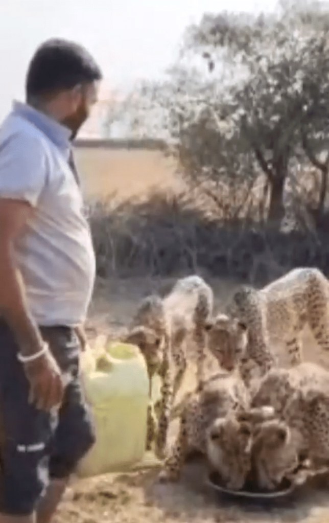 गर्मियों के दिन में पानी की कमी और बढ़ती प्यास को देखते हुए वन विभाग के अनुबंधित वाहन के ड्राइवर ने झुंड में चीतों के बैठे हुए एक झुंड को चौबे बर्तन में पानी रखकर पिला दिया.