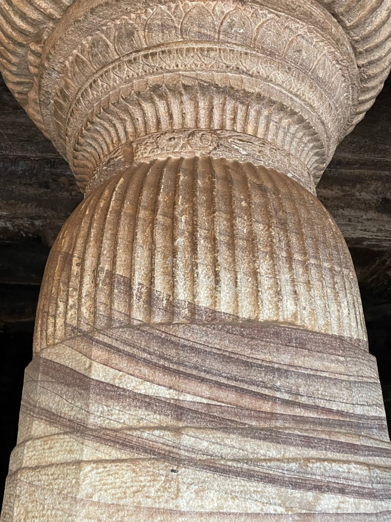 इन गुफाओं के खंभों से के भिन्न आकार के दृश्य होने की गोलाकार और सीढ़ीनुमा विन्यास उस दौर की शिल्प कर्मियों की कल्पना को प्रदर्शित करते हैं और इस दौर के नागरिकों के विस्मित होने का कोई कारण नहीं छोड़ते है. बादामी क्षेत्र की चट्टानों के हज़ारों वर्ष का इतिहास की उपस्थिति से चट्टान के पत्थरों में विभिन्न गहरे लाल और हलके लाल रंगों का अद्भुत द्रश्य प्रदर्शित होता है जो किसी प्राचीन दौर में समुद्र के जल के संपर्क में हज़ारों वर्ष तक बने रहने से समुद्र के जल स्तर में उपस्थित तत्वों जैसे मैगनीशियम, कैल्शियम, सेलेनियम आदि के कारण इन पत्थरों पर चट्टान पर गहरे लाल भूरे और स्याह रंग के अनमोल छटा भी प्रदर्शित करता है. इन मूर्तियों में भी पत्थर के विभिन्न रंग अपनी छटा बिखेरते हैं जिनके दर्शन मात्र से आपके मस्तिष्क की कोशिकाओं मैं आश्चर्य का अमृत दोगुना हो जाता है