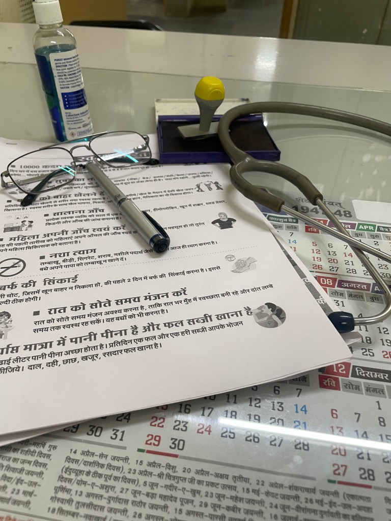 Okay. Dr stood up, went to the examination table where the patient was lying and examined her thorough & found Febrile, her spleen was enlarged, Conjunctiva pale & pedal Edema present. Doctor kept asking that any medication she is on or she is suffering with any disease like thyroid, hypertension or epilepsy or Diabetes. Noted her pulse, BP & auscultation her chest and got her RBS done.
